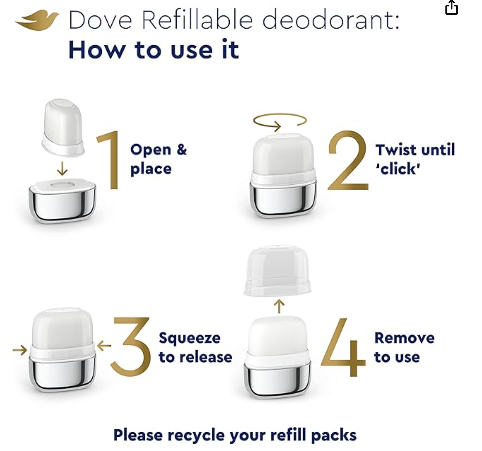 - REFILLABLE DEODORANT STARTER KIT: Dove proudly introduces their first refillable deodorant, the starter kit contains a reusable, stainless steel case and one deodorant refill