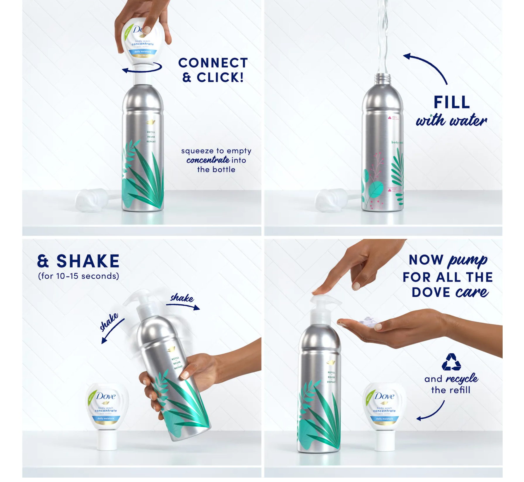 Reusable is beautiful: Start your journey with 2 Dove Body Wash Concentrates & Reusable Bottle starter kit featuring a premium, recyclable aluminum bottle,Buy once, refill for life: Just add water to create a moisturizing body wash, for instantly soft skin and lasting nourishment,No pour, no mess: Refill and reuse your refillable body wash bottle without the mess thanks to the easy-to-use, quick-connect cap,Reduce plastic waste over time: After just two refills, you ll be using 50 percent less plastic with every refill compared to standard Dove body wash,Dove body wash quality you can trust: Globally, Dove does not test on animals and is certified Cruelty Free by PETA,The perfect gift set for the holidays, birthdays, valentine s day for anyone who wants to reduce their plastic use over time with the same Dove care you know and trust