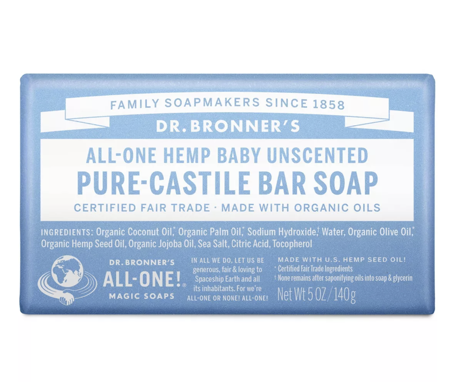Dr. Bronner's is packaged in 100% post-consumer recycled wrappers.Dr. Bronner's Baby Unscented Pure-Castile Bar Soap! With no added fragrance and double the olive oil, our Baby Unscented Pure-Castile Bar Soap is good for sensitive skin & babies too (though not tear-free!). Our Pure-Castile Bar Soap is made with certified fair trade ingredients and organic hemp oil for a soft, smooth lather that won't dry your skin. Readily biodegradable and packaged in a 100% post-consumer recycled paper wrapper. Dr. Bronner's Pure-Castile Bar Soaps are 100% cruelty-free, vegan, gentle, and versatile. With no synthetic preservatives, detergents, or foaming agents, they're even gentle enough for sensitive skin. They will leave your skin feeling soft, smooth, hydrated, and moisturized. All-One! Packaging contains recycled content