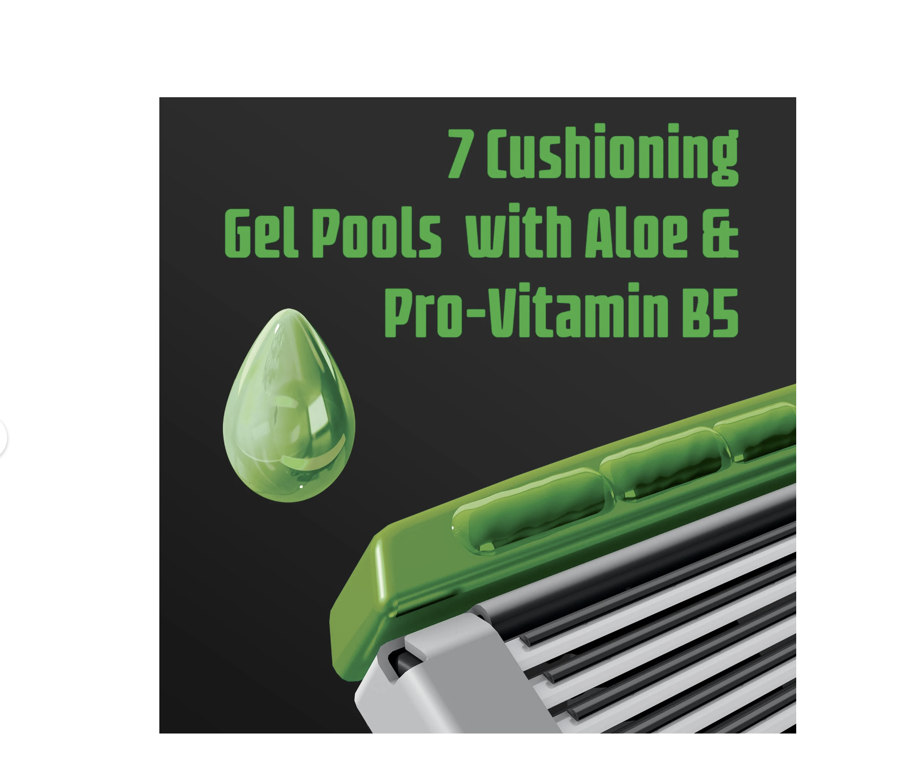 - 7 cushioning Pools, made with Aloe and Pro-Vitamin B5, hydrate skin throughout each shave and help reduce friction.